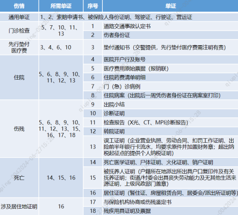 上表所列為車險人傷理賠單證參考,具體所需材料還需與保險公司溝通并根據(jù)實際事故情況確定。